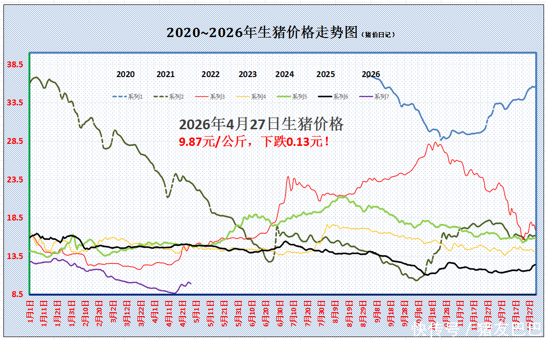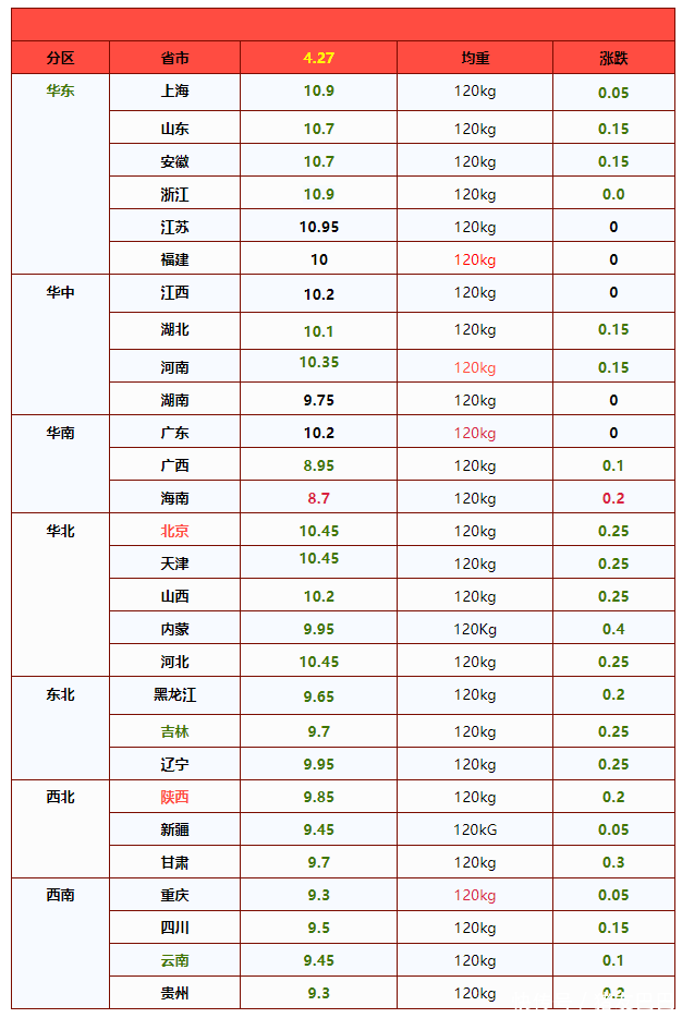 据数据显示,截至4月27日,全国瘦肉型外三元标猪出栏均价在9.87元/公斤,相比昨日下降0.13元/公斤,猪价迎来“2连降”,且,降幅略有走扩,国内南北地区,猪价又是“绿油油”,市场呈现下跌“猛抬头”的局面!从分区来看,全国生猪均价与陕西地区9.85元/公斤相近,在重点监测的28个地区,生猪报价普遍在9.3~10.95元/公斤,区域猪价存在一定价差,南北地区市场仍有“倒挂”现象,川渝报价9.3~9.5元/公斤,价格低于黑吉辽报价9.65~9.95元/公斤的水平。