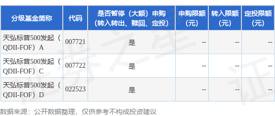 本站消息配资炒股开户网,11月6日天弘基金管理有限公司发布《天弘基金管理有限公司关于天弘标普500发起式证券投资基金(QDII-FOF)调整大额申购及定期定额投资业务的公告》。公告中提示,为了保证基金的平稳运作,保护基金份额持有人利益,自2025年11月7日起天弘基金管理有限公司关于天弘标普500发起式证券投资基金(QDII-FOF)调整大额申购及定期定额投资业务,申购、定投上限金额为0.01万元,下属分级基金调整明细如下: