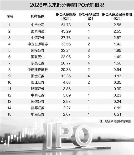 在承销及保荐收入方面,中信证券以2.67亿元拔得头筹,中金公司(2.56亿元)与国泰海通(2.55亿元)分列二、三位,三者合计占据年内券商IPO承销保荐收入逾四成。